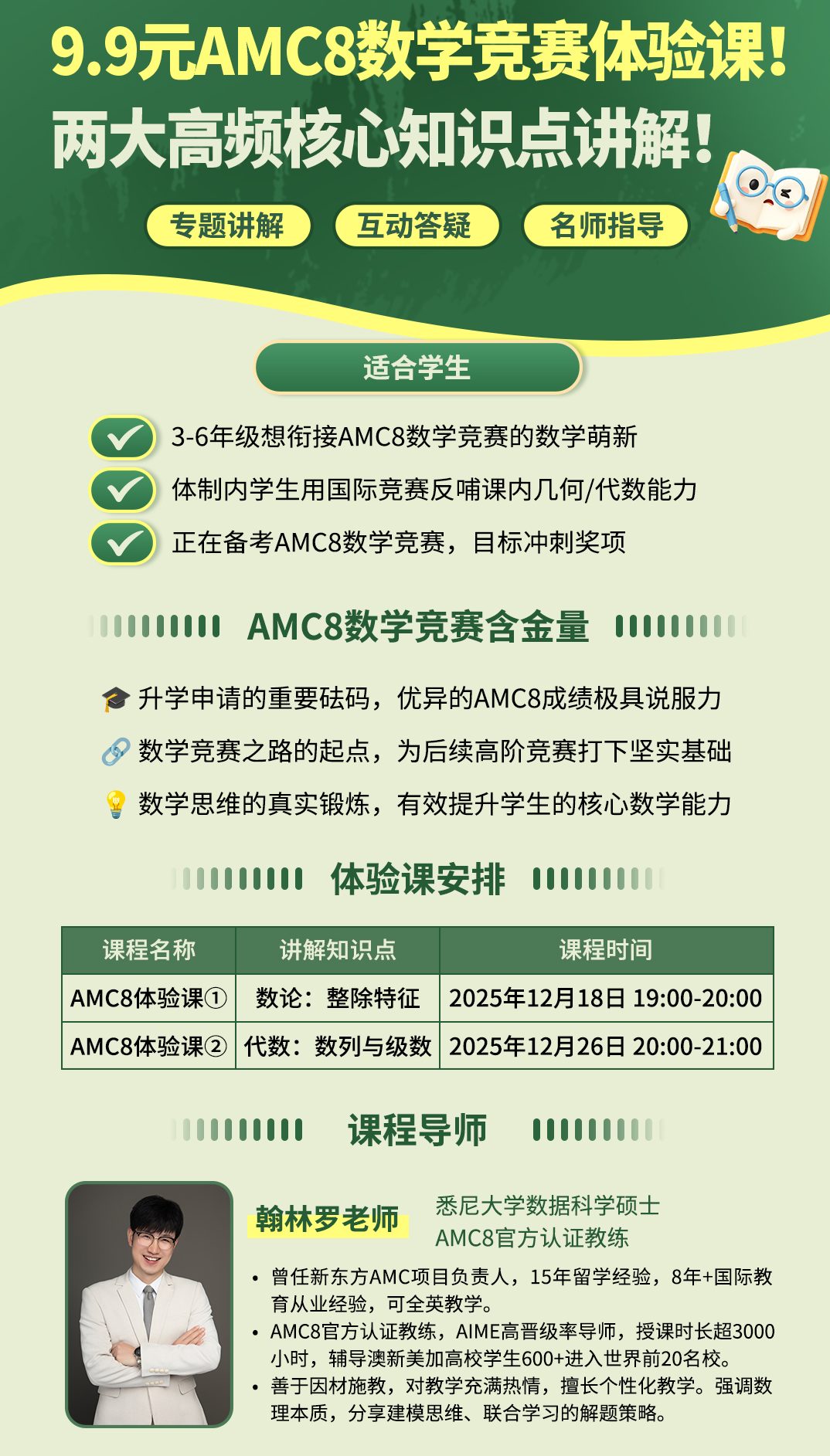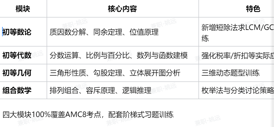 核心定位:针对低龄段学生的“入门引导型”套餐。强调通过Pre-AMC8教材补齐小学阶段重难点知识(如分数计算、方程应用等),并利用体验课和基础工具降低竞赛入门门槛。