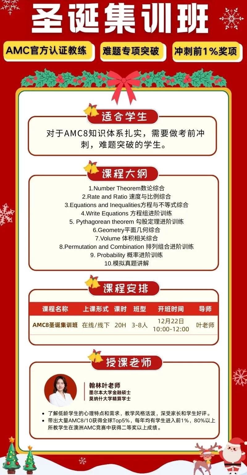 课程将涵盖AMC数学竞赛中的常见题型和解题技巧,包括代数、几何、概率等方面,并为学生提供模拟测试和个性化反馈,以强化他们的技能和自信心。课程将为参与者提供全面的指导和支持,帮助他们克服难关,顺利完成AMC数学竞赛的考试。